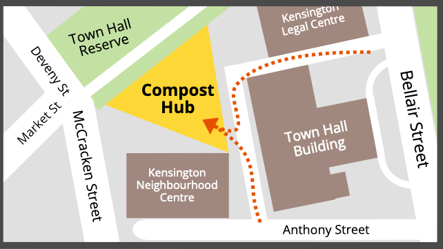 The Town Hall Compost Hub behind Kensington Town Hall is open for public access and managed by Kensington Town Hall Compost Incorporated (KTHCI).